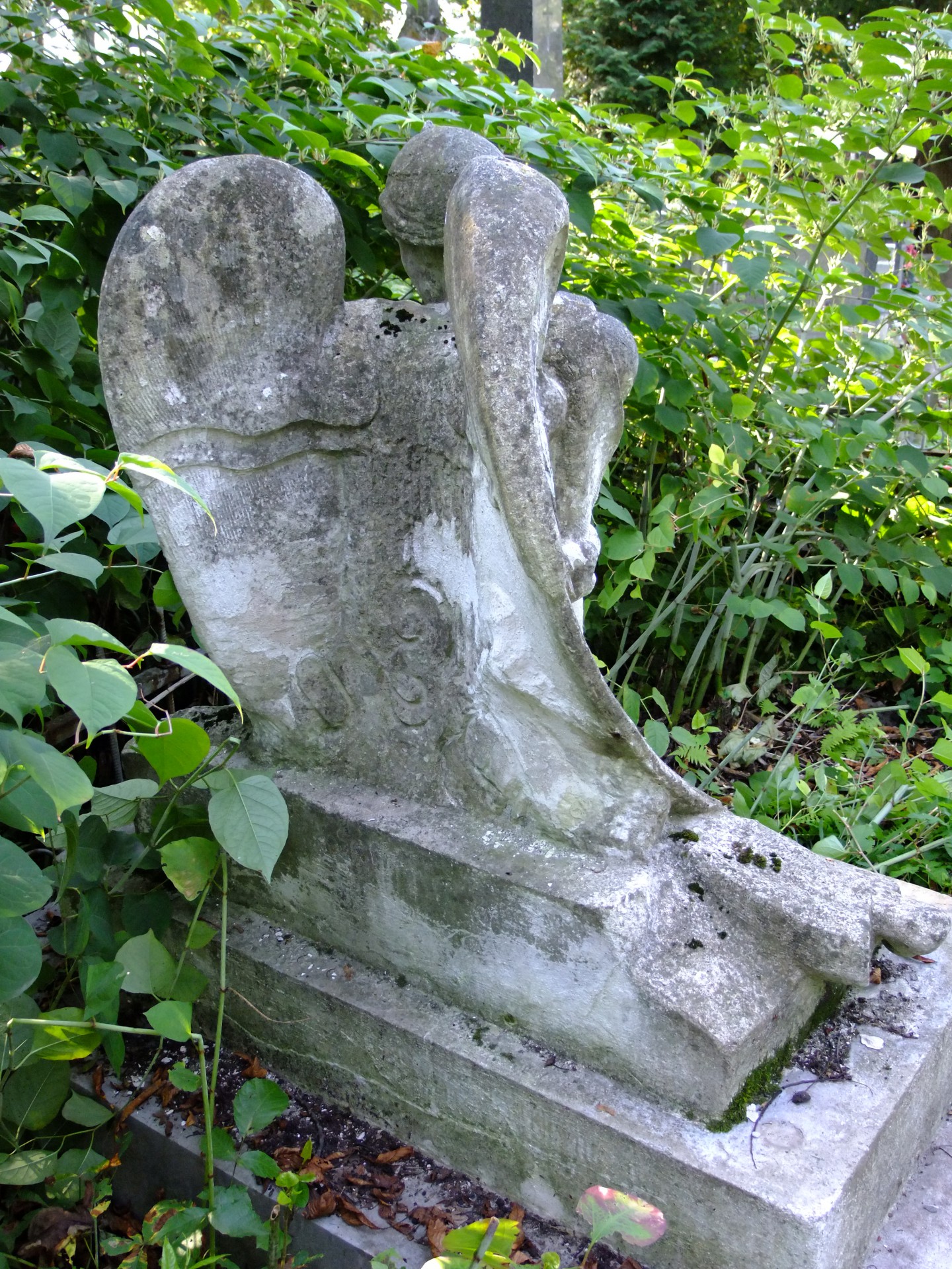 Pełnoplastyczna postać Anioła ze złożonymi skrzydłami wspartego o prostokątna tablicę z wyrytym napisem "PAX". Całość na zdwojonym cokole.